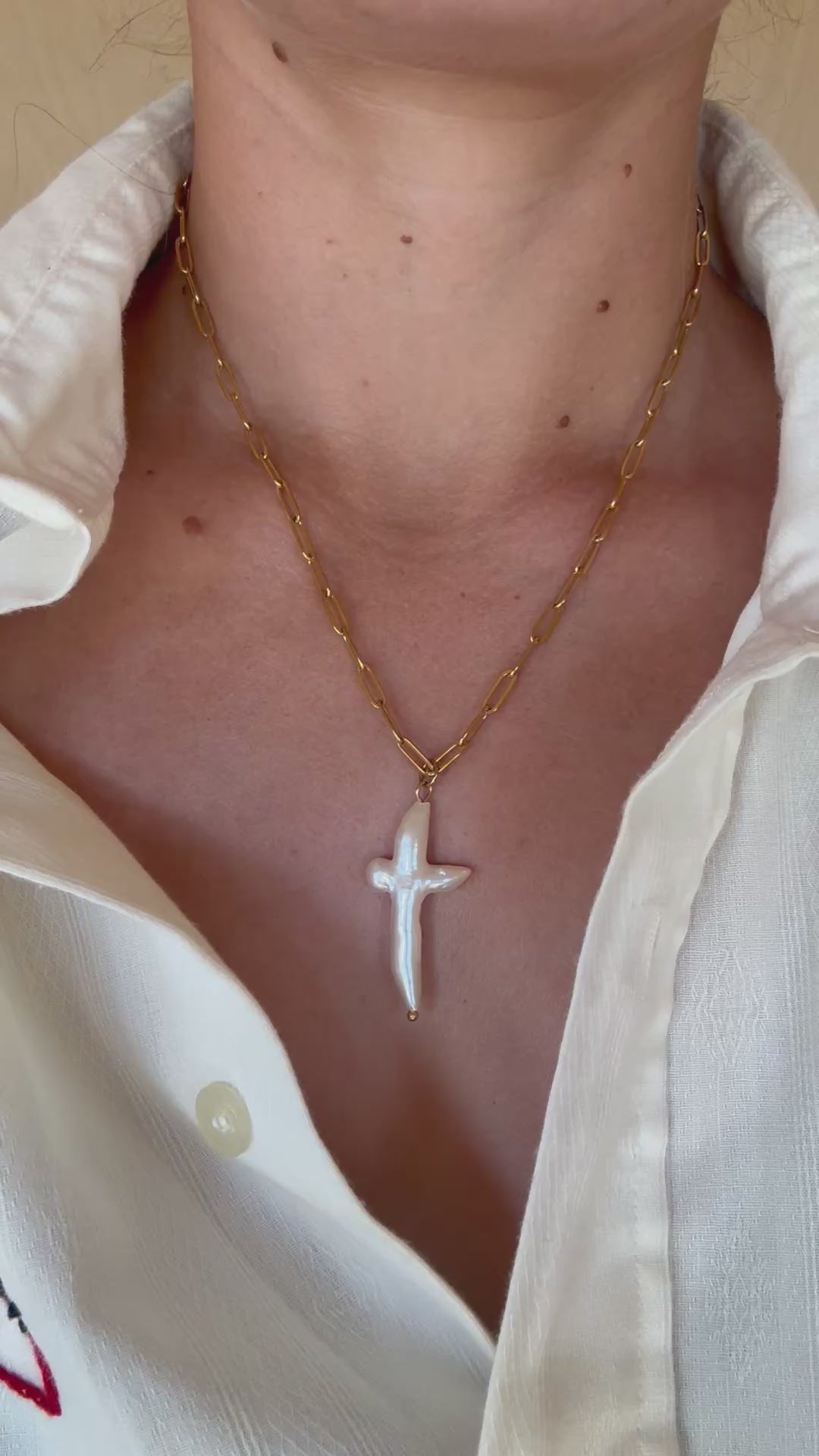 Fresh water pearl- its irregular movement is part of the beauty and uniqueness of the pearl, not one is the same. It was gently formed into a cross.